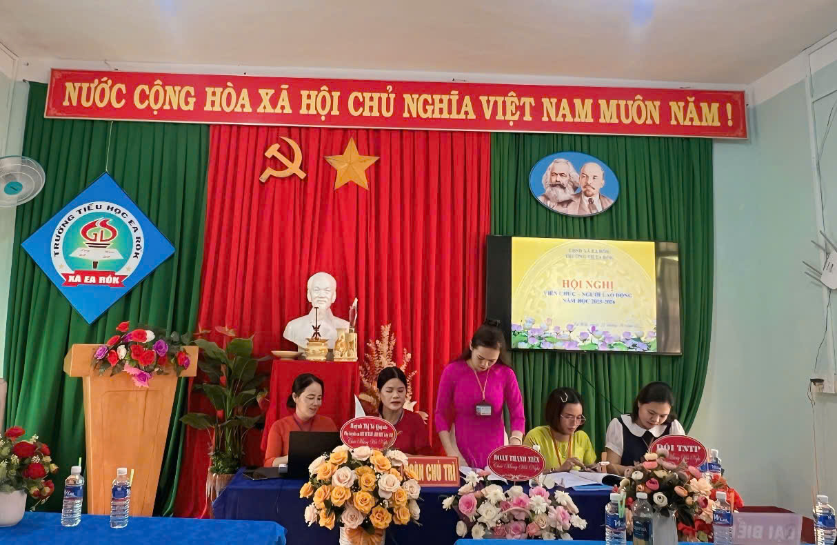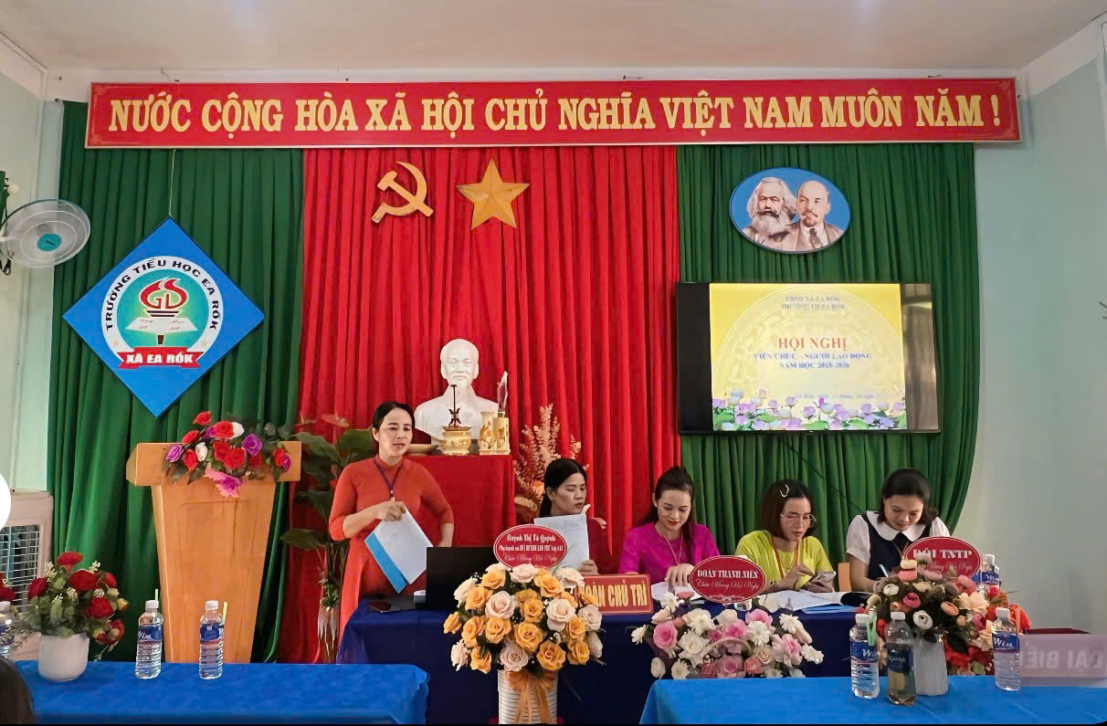 Hội nghị viên chức, người lao động là một trong những hoạt động trọng tâm đầu năm học, góp phần phát huy dân chủ trong nhà trường, tạo sự đồng thuận, thống nhất cao trong việc triển khai nhiệm vụ năm học. Hòa trong không khí thi đua sôi nổi đầu năm, Trường Tiểu học Ea Rốk đã long trọng tổ chức Hội nghị viên chức, người lao động năm học 2025 – 2026. Đây là hoạt động thường niên quan trọng, nhằm đánh giá kết quả thực hiện nhiệm vụ năm học trước, đề ra phương hướng, nhiệm vụ và các giải pháp trọng tâm cho năm học mới, đồng thời phát huy vai trò làm chủ, tinh thần đoàn kết của toàn thể cán bộ, giáo viên, nhân viên nhà trường.